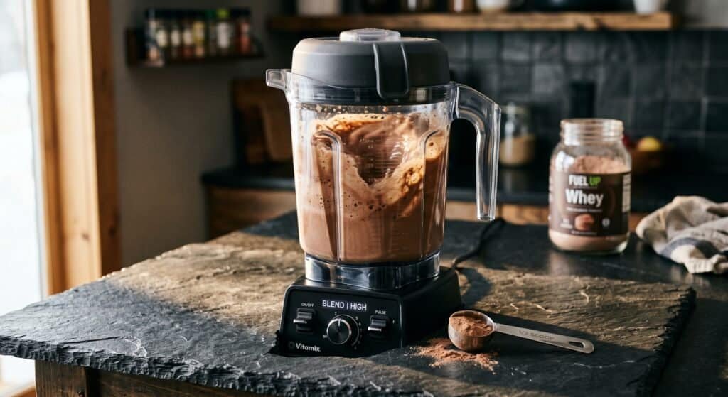 Blend on high speed for 60–90 seconds until the mixture is completely silky smooth. No foam, no lumps, no protein powder clumps.