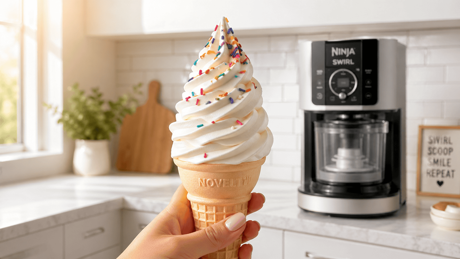 Makes: ~2–3 soft serve cones or 4 small cups Prep time: 5 minutes Freeze/chill time: Per Ninja Swirl instructions (see your manual) Total active time: 10 minutes
